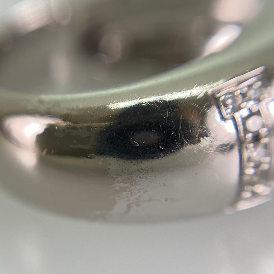 There is some staining and dullness on the back of the diamond that cannot be completely removed.