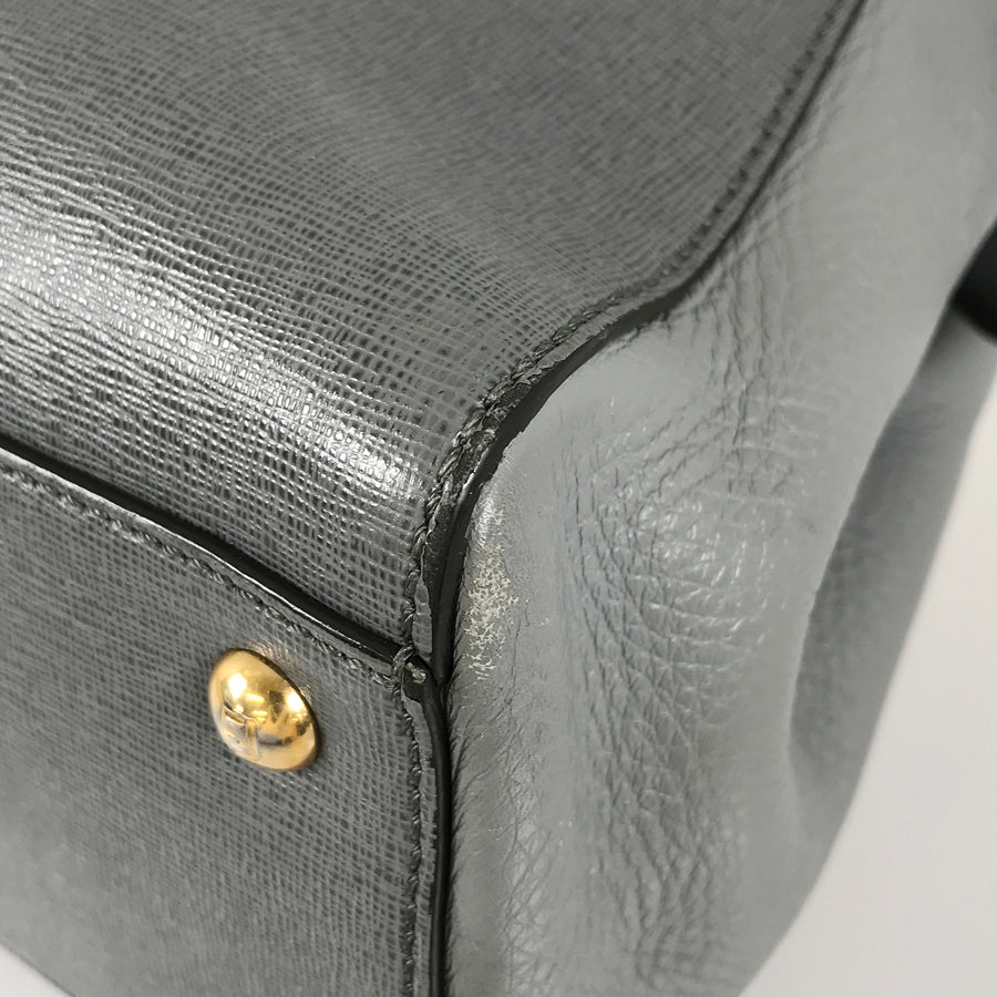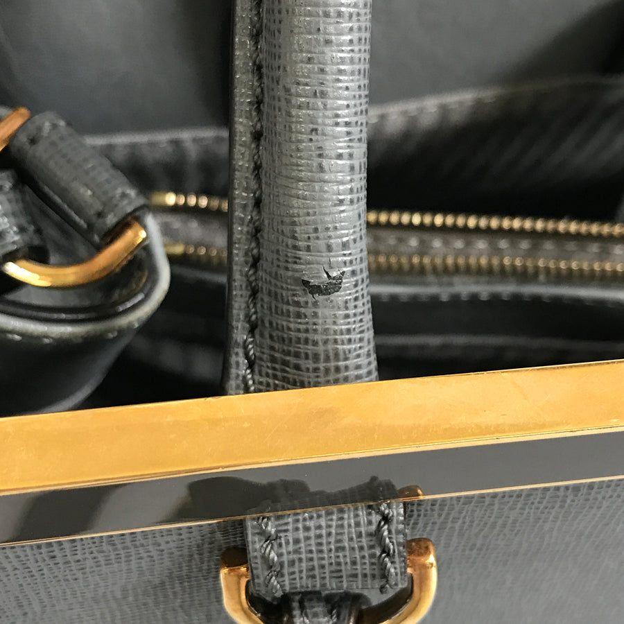 Hardware has dullness, small scratches, and peeling of plating.