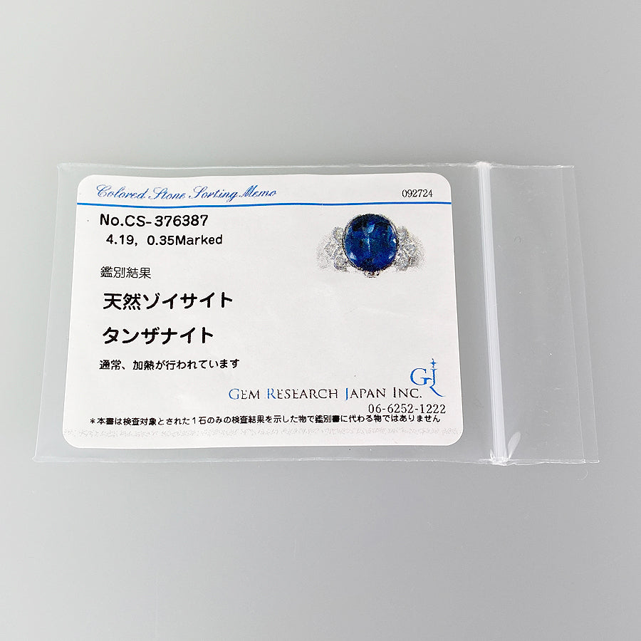 SizeJP:11.5 SizeUS:5.5-6 SizeEU:51-52 SizeUK:L-M Ring width:0.1"-0.5" Weight:11.3g Tanzanite: 4.19ct Diamond: 0.35ct