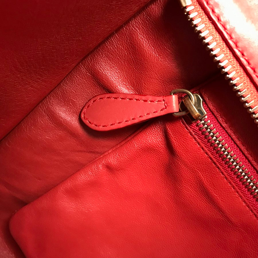 Outside: There is a shape collapse on the whole. There is Wrinkles scratch Indentation on the surface. There is scrubStain on the corners and edges. Hardware has Slight Scratch plating peeling.