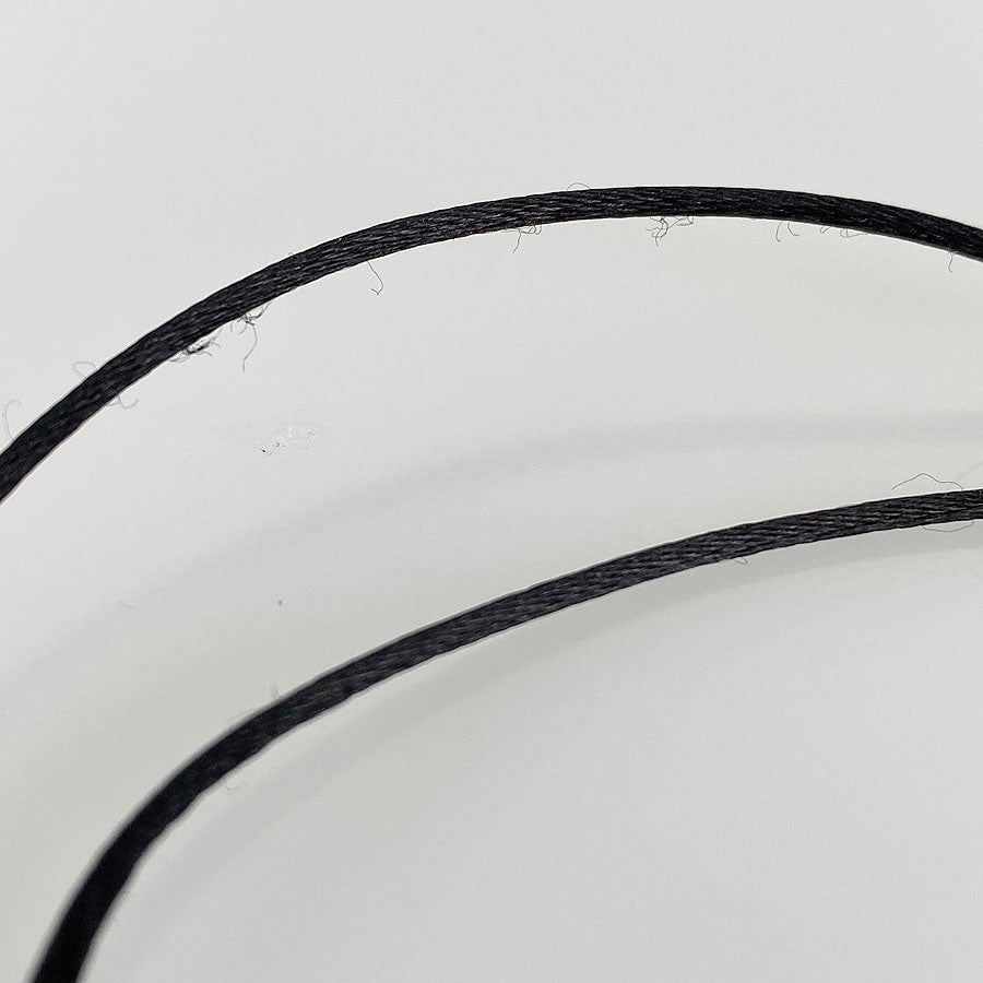Overall: The satin cord has some scrub and some fluffing, and there is some stain at the knot.