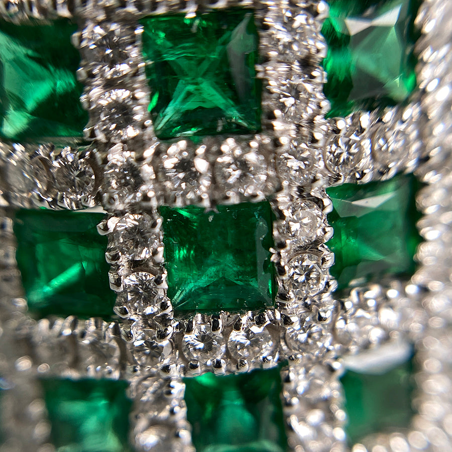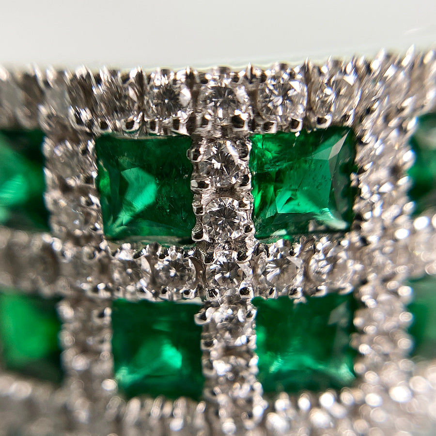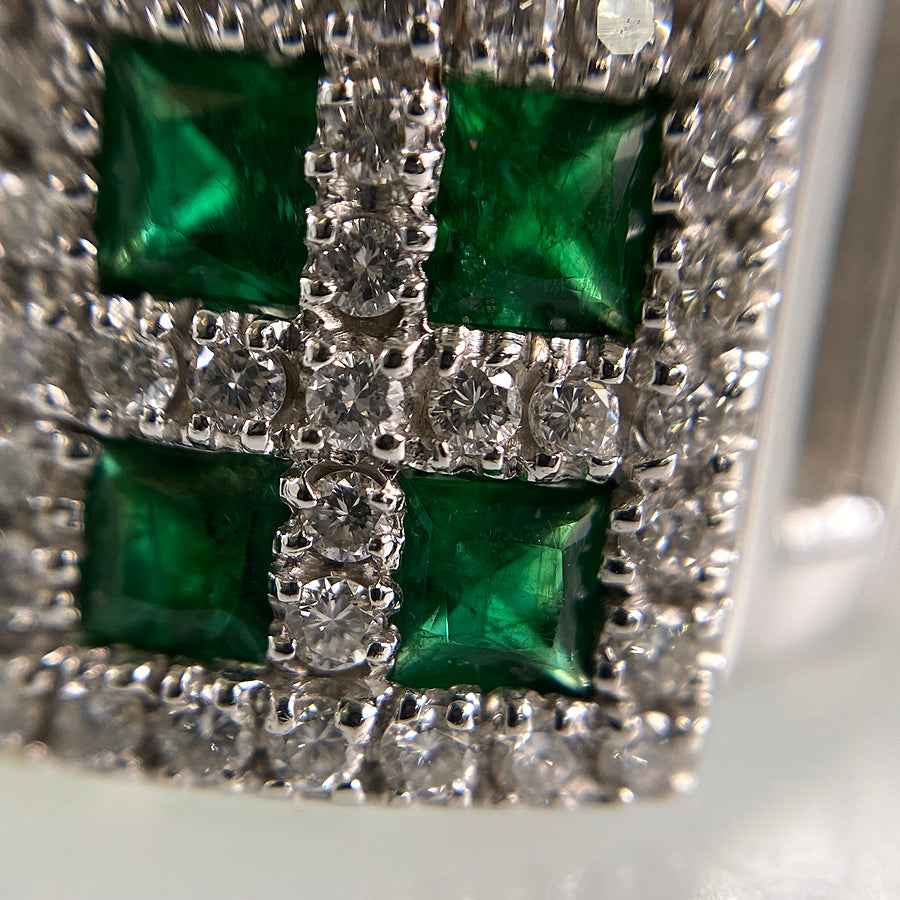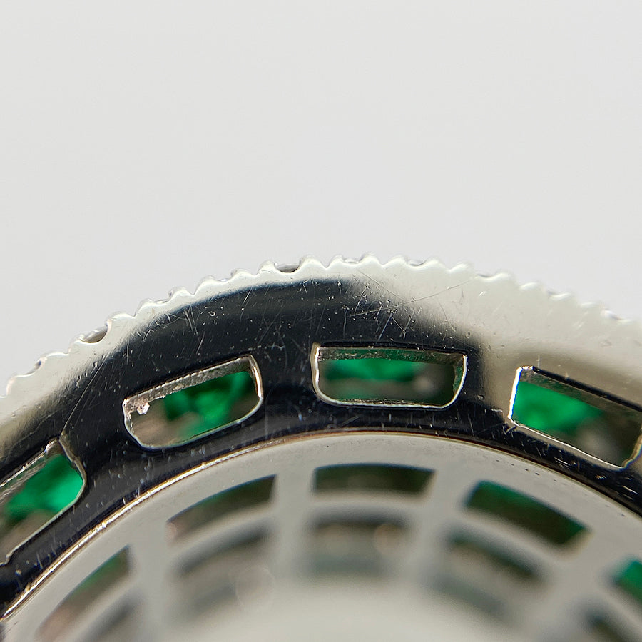 Emerald/Diamond: The emerald contains scratches and inclusions on its surface.