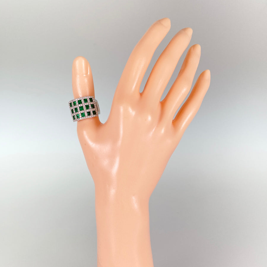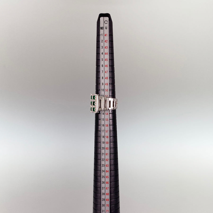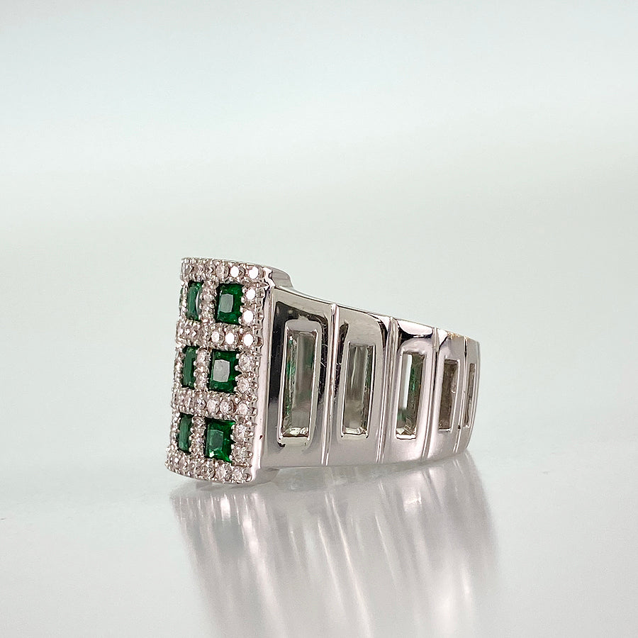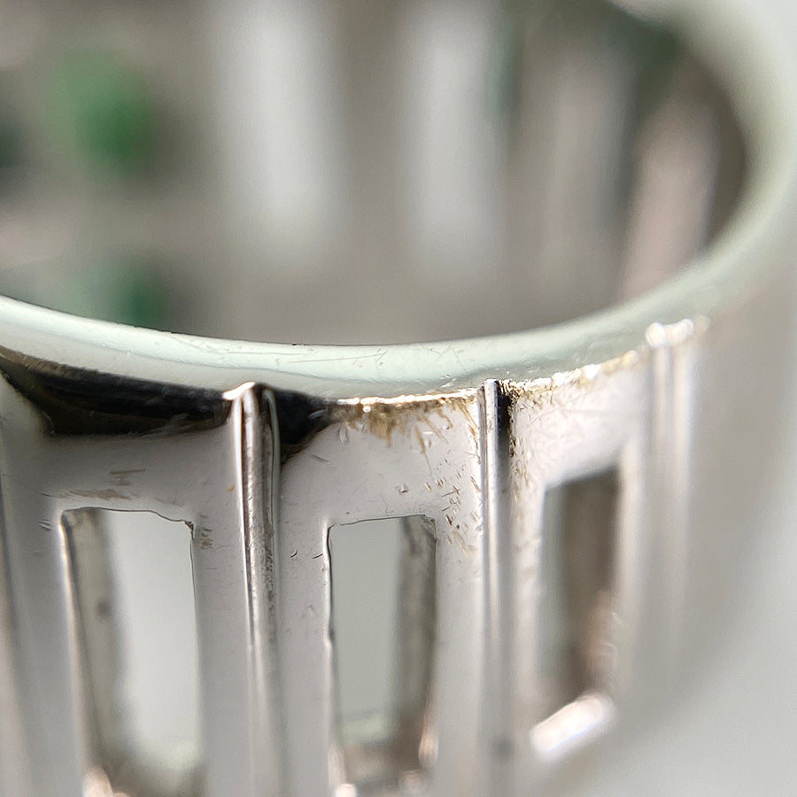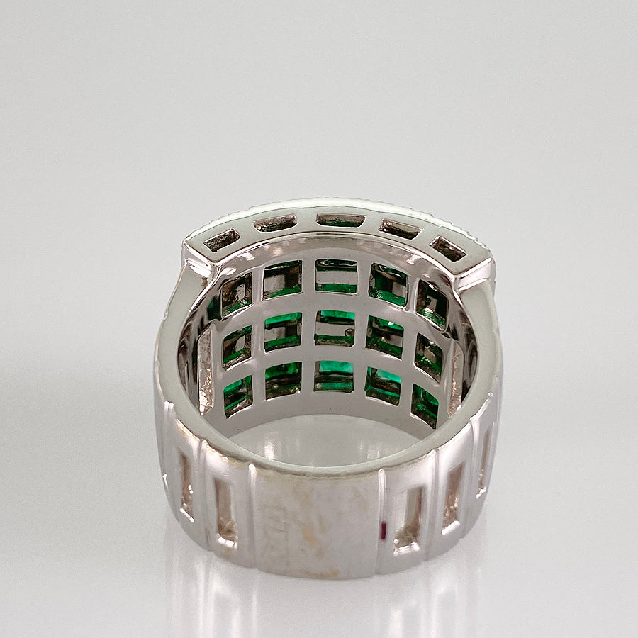 Emerald/Diamond: The emerald contains scratches and inclusions on its surface.