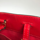 The leather at the opening has wrinkles, small scratches, stain spots, and some peeling.