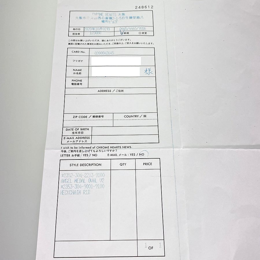 Invoice copy (purchased from Chrome Hearts Osaka on October 2, 2020)