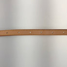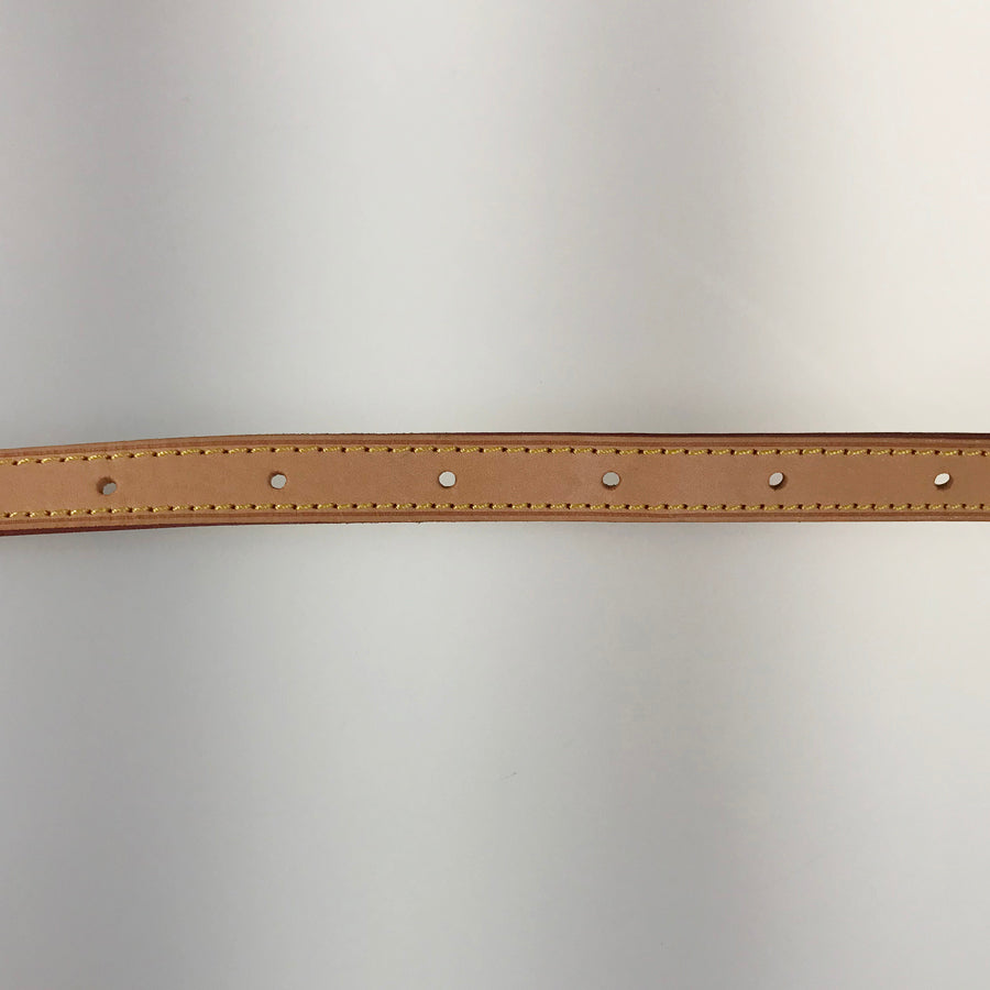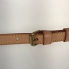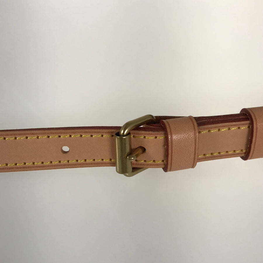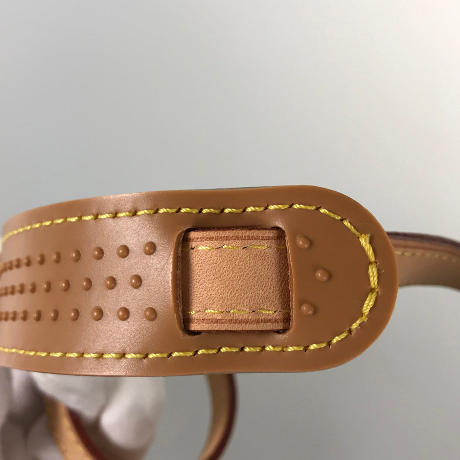 Strap: Natural leather. Rubbed and scratched throughout, with some wrinkles and stains.
