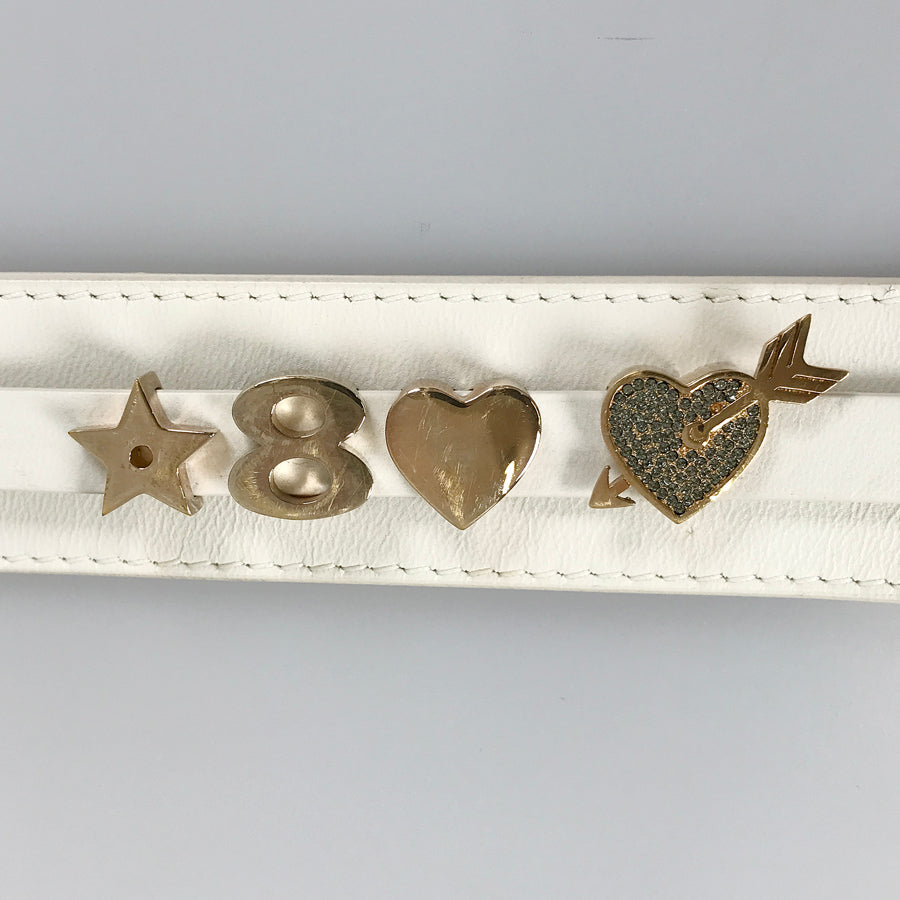 The charm's hardware has tarnish and small scratches, and the leather has wrinkles and stains.