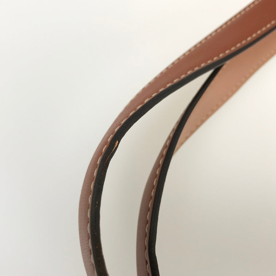 There is a slight stain around the base of the beige side of the strap.