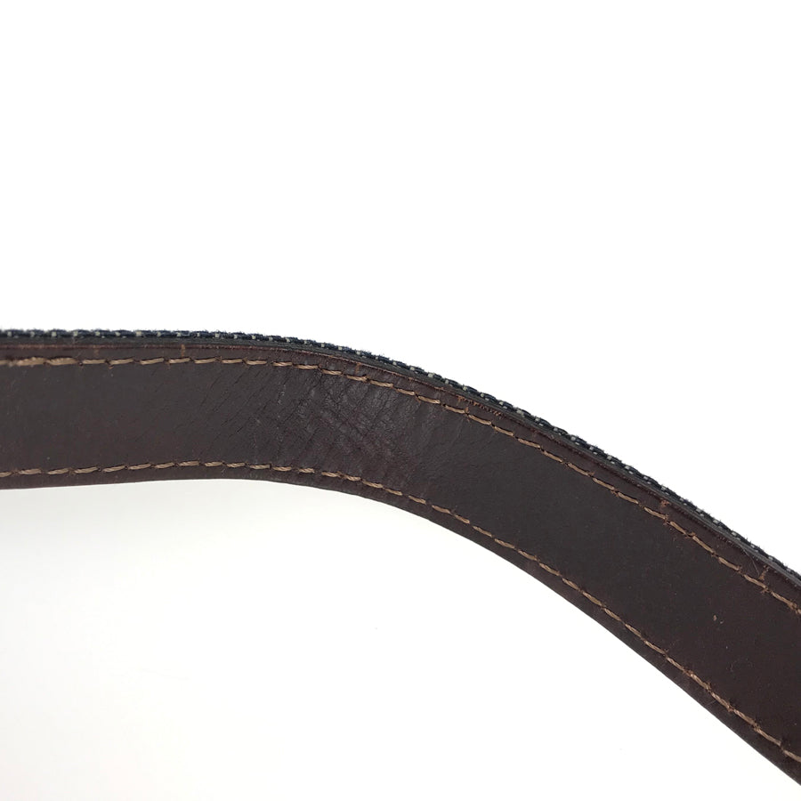 The denim fabric has fluffing, slight stains, and light scratches.