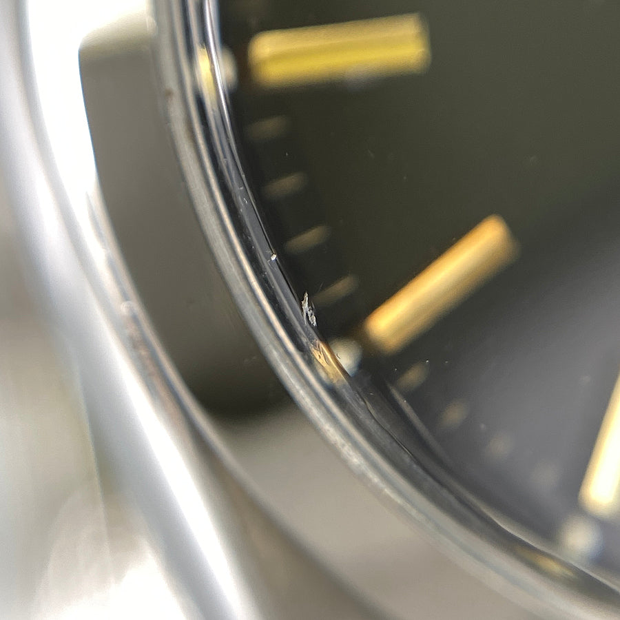 There are some slight scuff marks around the 6, 9, and 12 o'clock positions on the edge of the crystal.