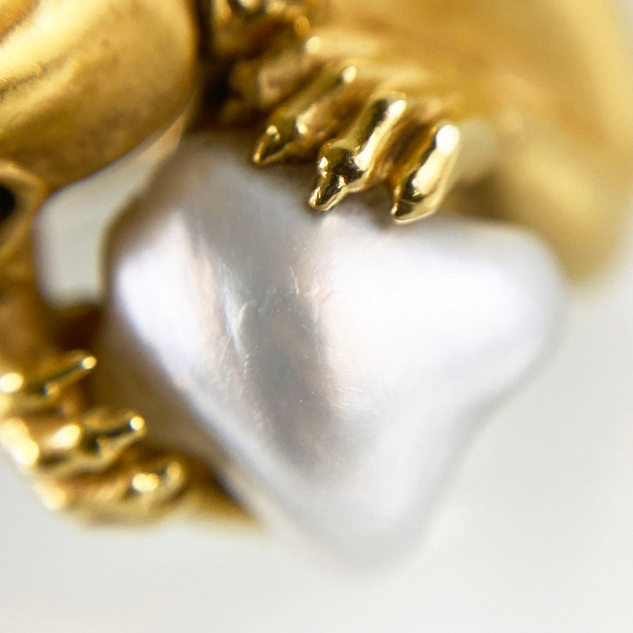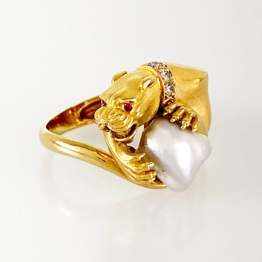 - 18K Yellow Gold baroque pearl ruby diamond