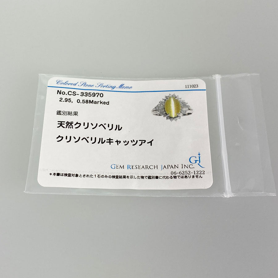 SizeJP:12 SizeUS:6 SizeEU:52 SizeUK:M Ring width:2.9mm-13.6mm Weight:6.7g Chrysoberyl Cat's Eye:2.95ct diamond:0.58ct